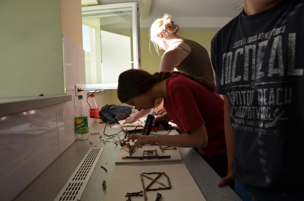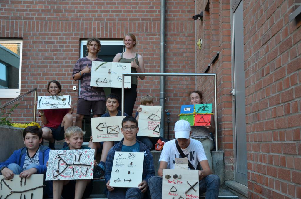 Wie haben sich damals die Pfadfinder wohl verständigt, wenn sich die Gruppe aufgeteilt hat, um vorzugehen? Mit Waldläuferzeichen. Diese Waldläuferzeichen, meist gemacht aus dem was einem der Wald gibt, also Stöcken und Steinen, weisen den Weg für die hintere Gruppe, damit auch diese zum Lagerplatz gelangt. Die Jupfis haben in der letzten Truppstunde ein Teil der Waldläuferzeichen auf Brettern verewigt und zum Auswendiglernen vorbereitet.