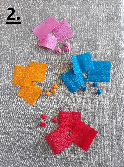- Schneide das Krepppapier in kleine Vierecke und rolle sie zu kleinen Kügelchen.