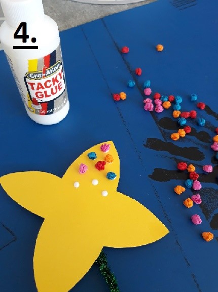 - Wenn die Blüte am Strohhalm befestigt ist kannst du kleine Punkte Bastelkleber auftragen und darauf die Krepppapier Kügelchen kleben.